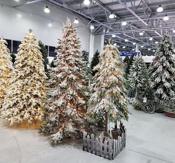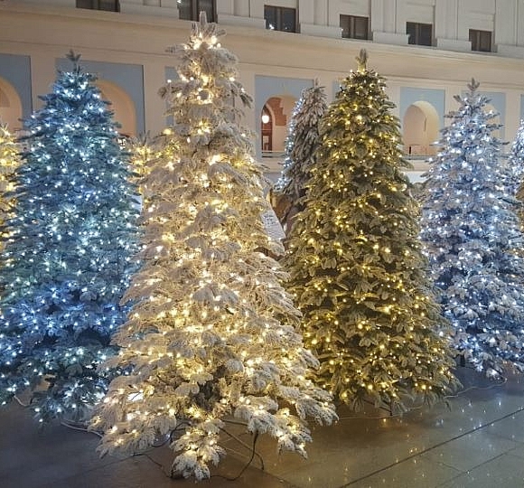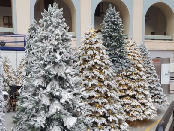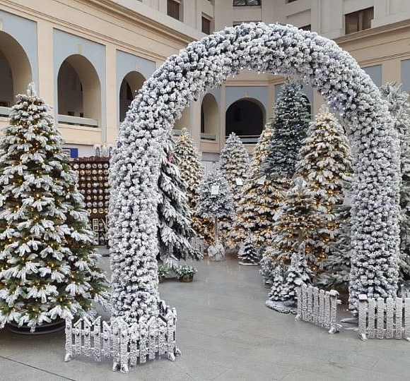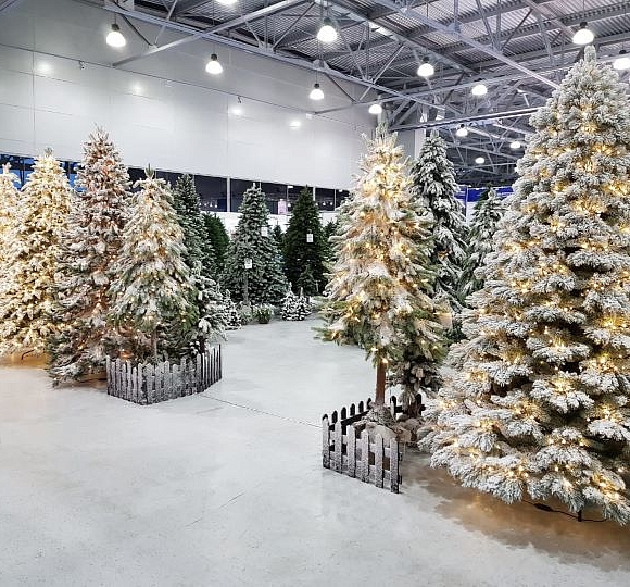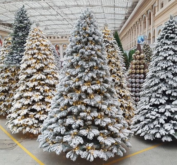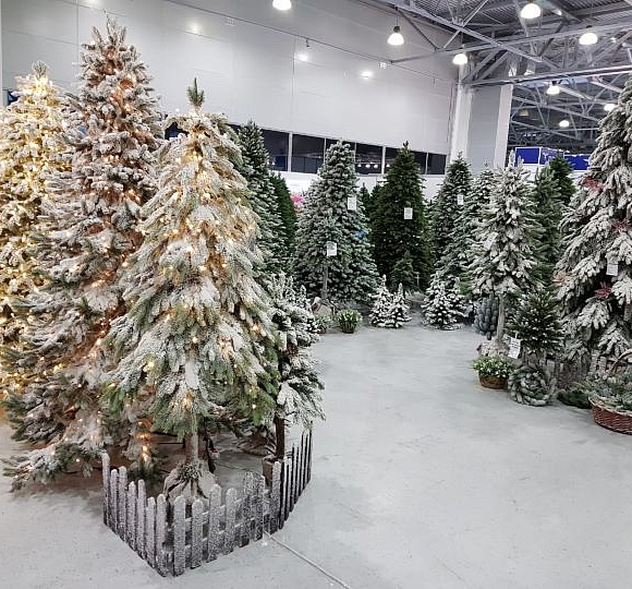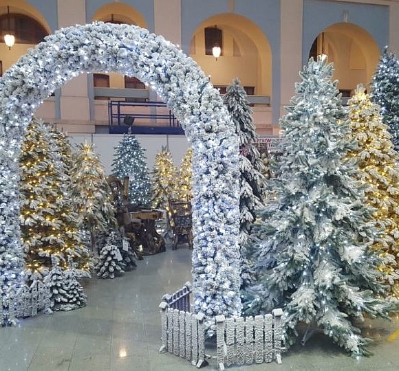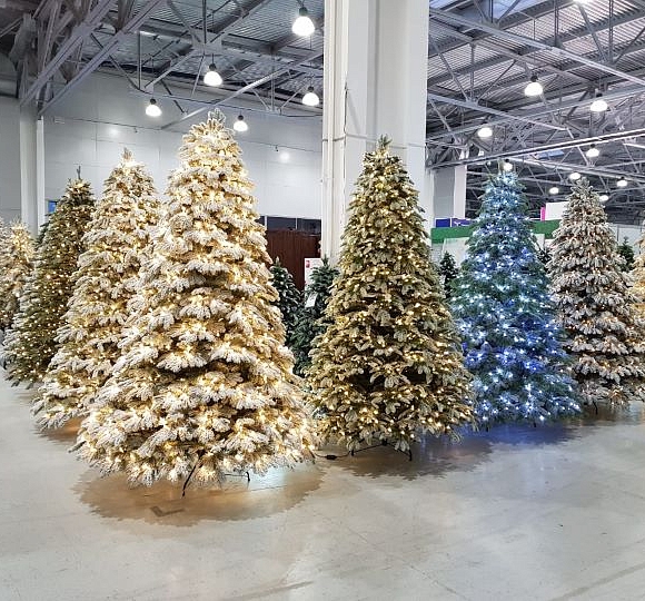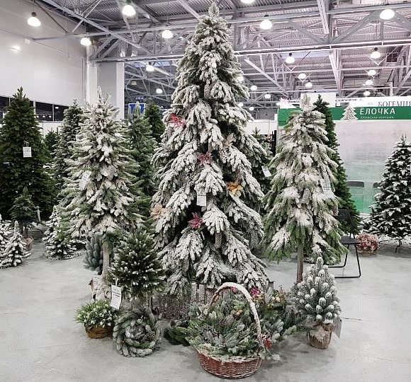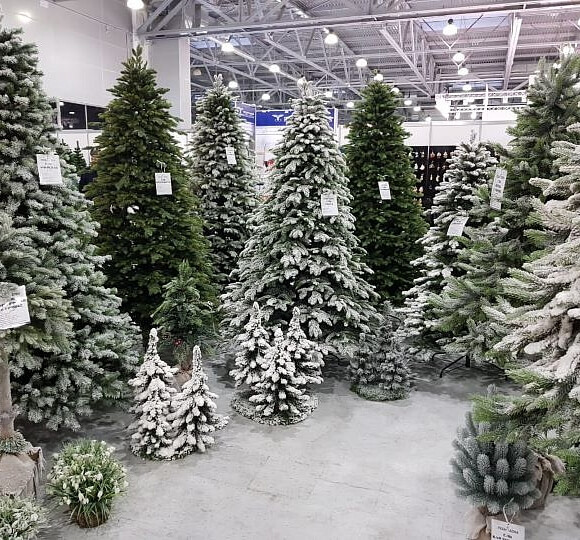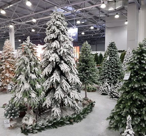 - широкий ассортимент искусственных новогодних елей и интерьерных украшений,